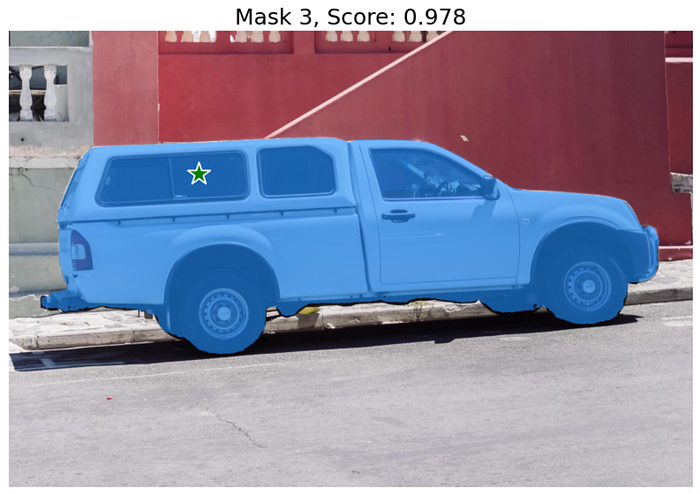 To select the truck, choose a point on it. Points are input to the model in (x,y) format and come with labels 1 (foreground point) or 0 (background point). Multiple points can be input; here we use only one. The chosen point will be shown as a star on the image.
